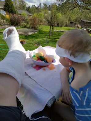 Já se ani nestačila vzpamatovat z toho, že mám sádru na noze a syn spadl na schody a rozsekl si čelo, má 4 stehy. Takže já do toho všeho ještě skákala po jedné noze na chirurgii se synem.